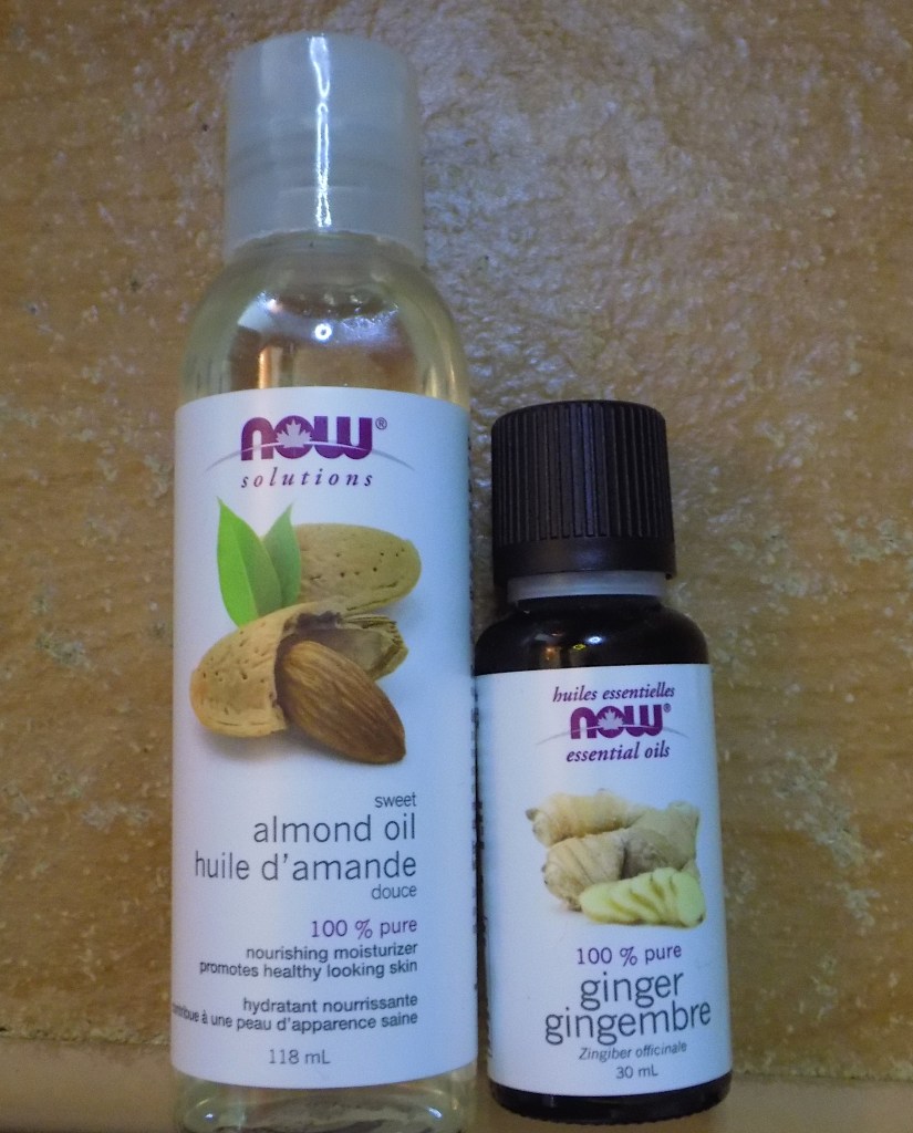 To use almond oil and ginger oil together, add a quarter-sized amount of almond oil to your palm and mix in a single drop of ginger oil, then apply to the face, neck, and decolletage.