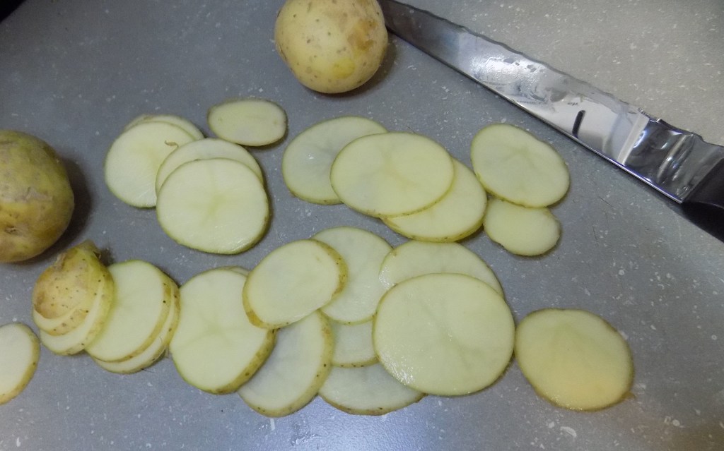 -Slice your potatoes into little discs, taking special care to ensure they’re all roughly the same size. Doing so will allow them to cook at the same rate, producing evenly browned potatoes.