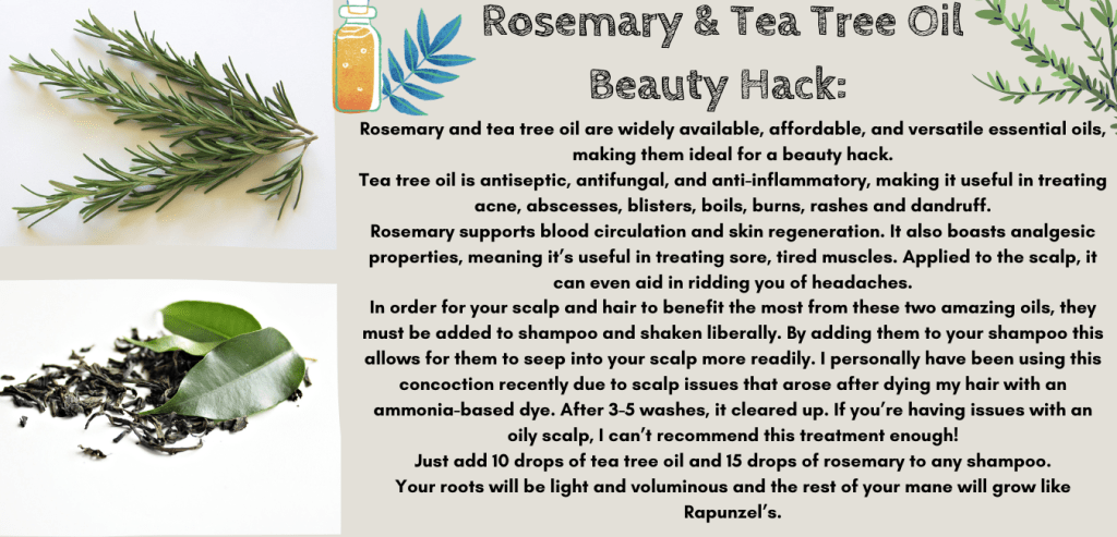 Rosemary and tea tree oil work in tandem, providing a synergistic effect that reduces oiliness/dandruff and promotes circulation, which stimulates hair growth.