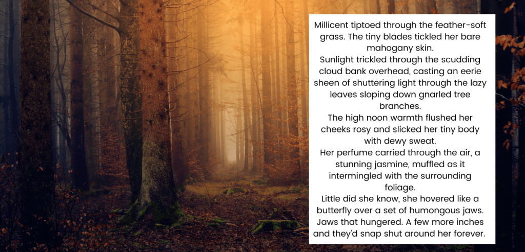 In the Writing Corner: A writing prompt, featuring a young woman loping through a magical forest.