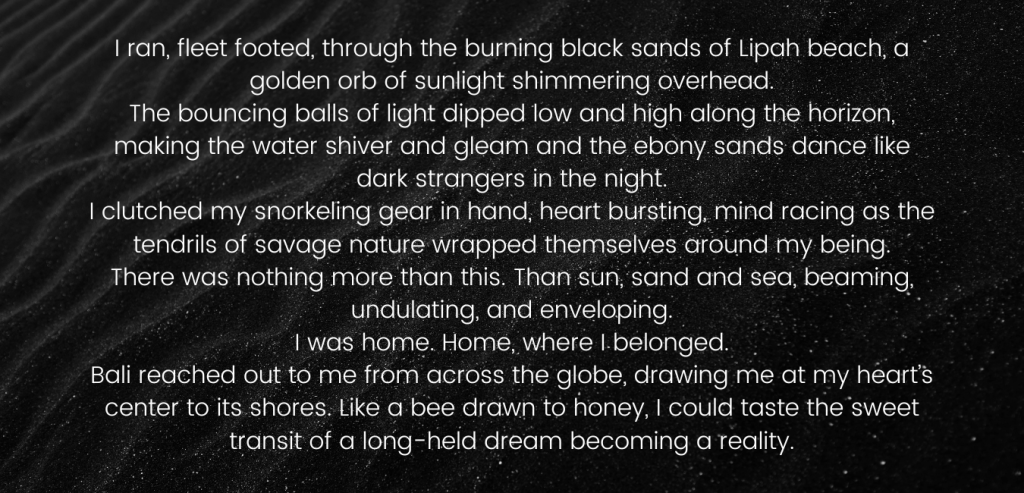 In the Writing Corner: A beach-themed piece of micro fiction featuring the black sands of Bali on Lipah Beach; a place renowned for its beauty and recreational snorkeling.